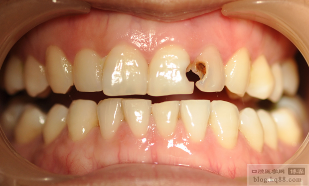 檢查:21遠中22近中充填物脫落,色暗,21牙冠變色