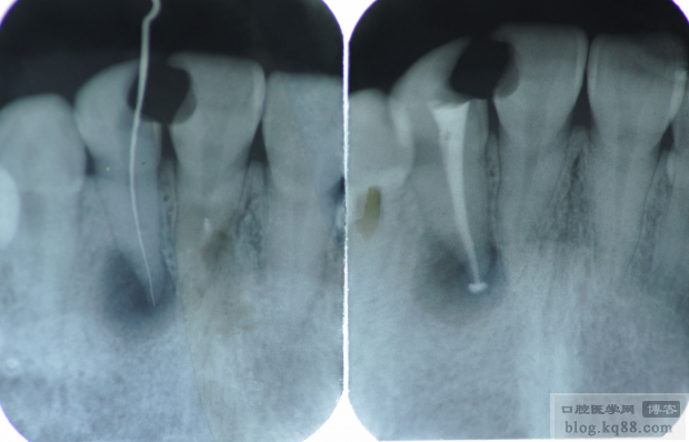 22根尖區(qū)陰影,但是該牙未見明顯不適,所以行一次性根管治療(插針片和根充片如下)