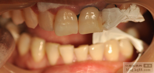 分層充填,其中背板我用的是GC的幻彩樹脂,中間用的KERR的樹脂